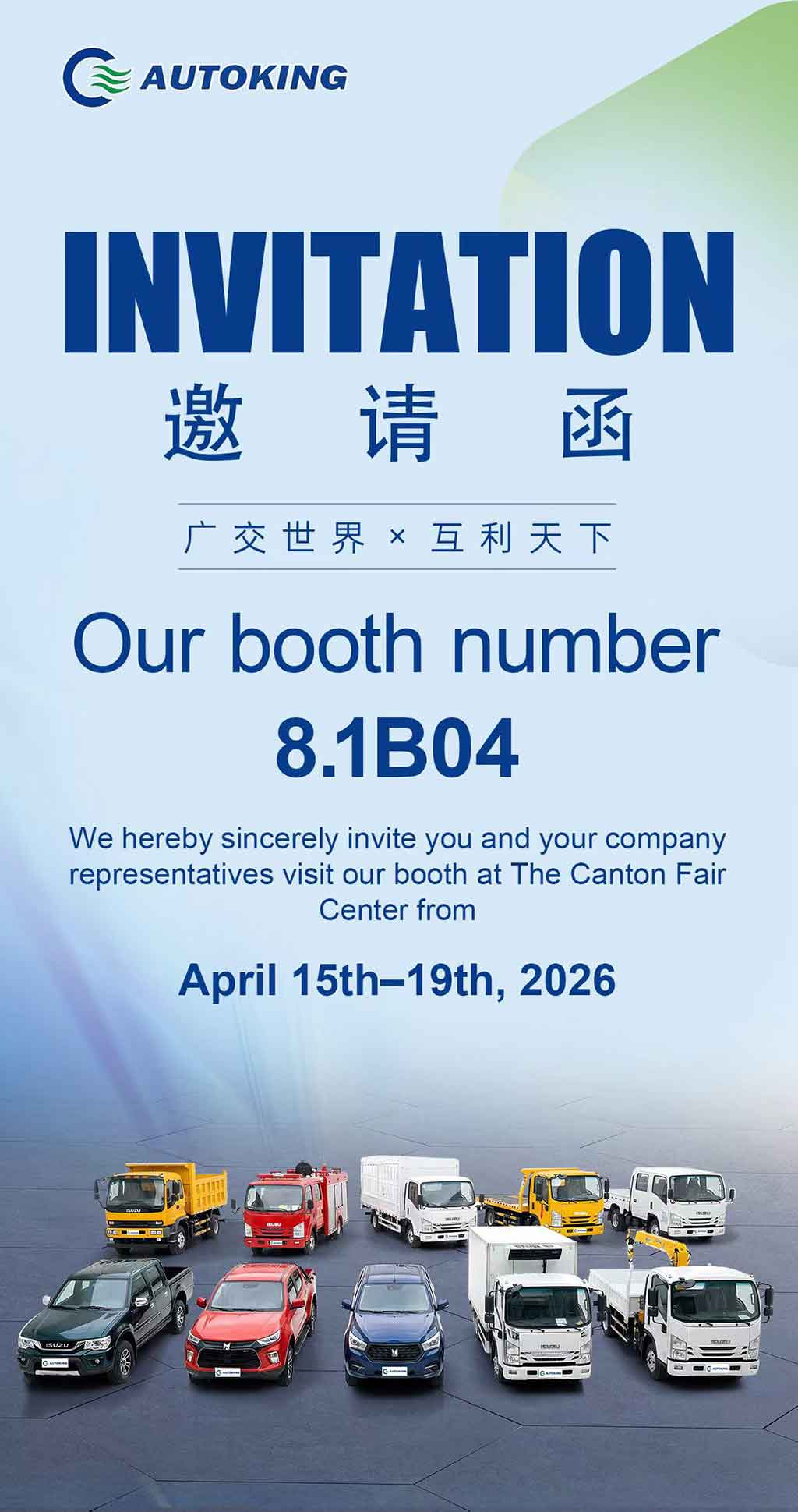 We Autoking Aare thrilled to invite you and your company representatives to visit our booth at the 2026 Canton Fair.